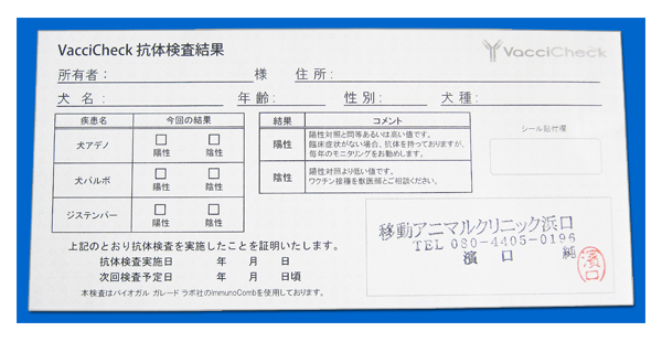 抗体検査の項目は、犬のジステンパー、アデノウイルス、パルボウイルスです。この3つは感染するととても重い症状を発症することがあるので、ワクチン接種の核となることから「コアワクチン」と呼ばれています。